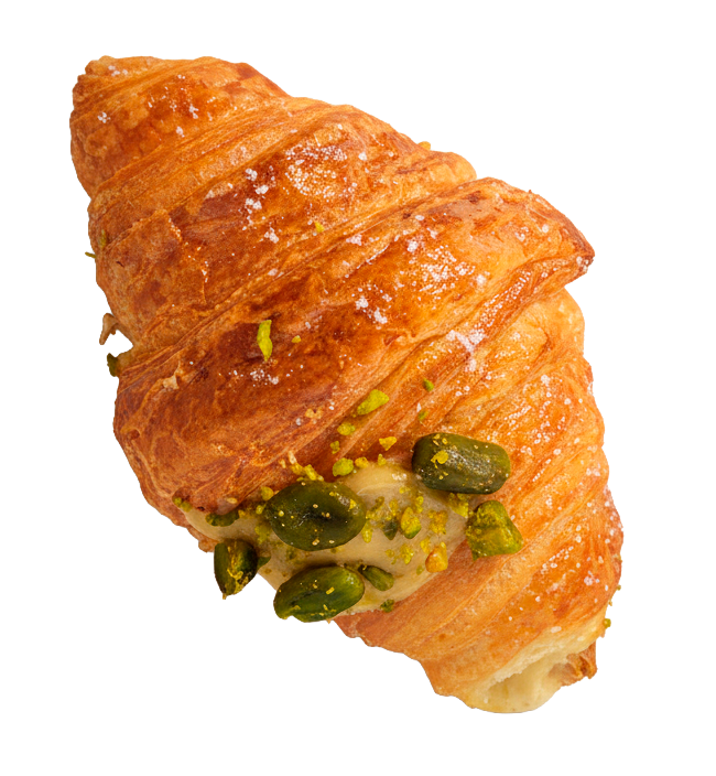 Mini cruasán de mantequilla relleno de crema de pistacho suave, con cobertura ligera y textura crujiente