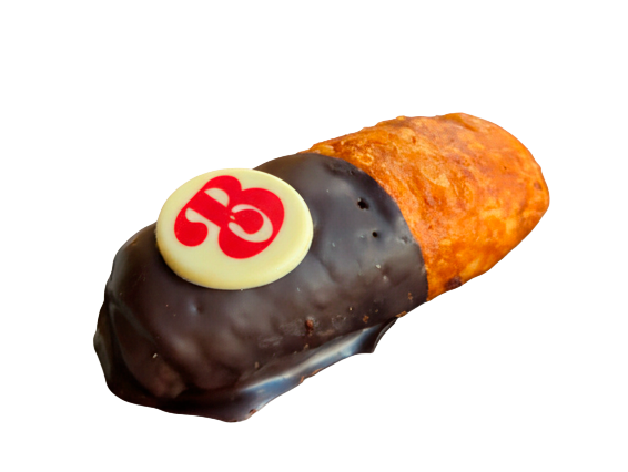 Tierno y crujiente, relleno de crema pastelera casera y recubierto con chocolate negro